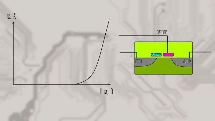 У нас есть исток и сток, проще говоря вход и выход, и между ними область через которую может проходить заряд от стока к истоку, и есть ещё одна отделённая область от этих структур диэлектриком, которая называется — затвор. И если подать заряд на затвор, то затвор своим электромагнитным полем начинает влиять на легированную часть транзистора между стоком и истоком и этим перекрывает возможность протекания тока между ними.